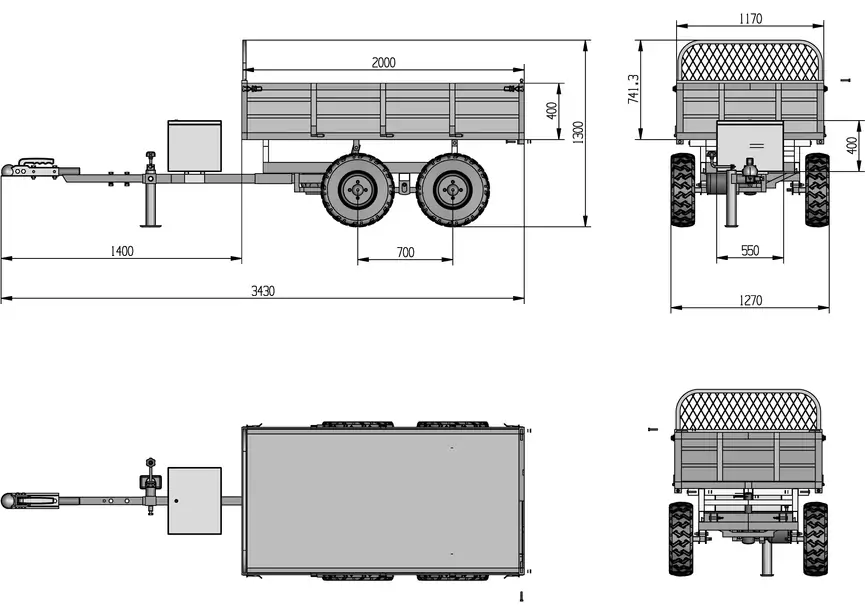 Außenmaße des Anhängers: 3430 x 1270 mm, Höhe 1300 mm