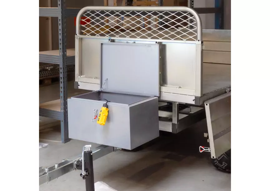 12-V-Pumpe in einer wasserdichten Werkzeugbox an der Anhängerkupplung