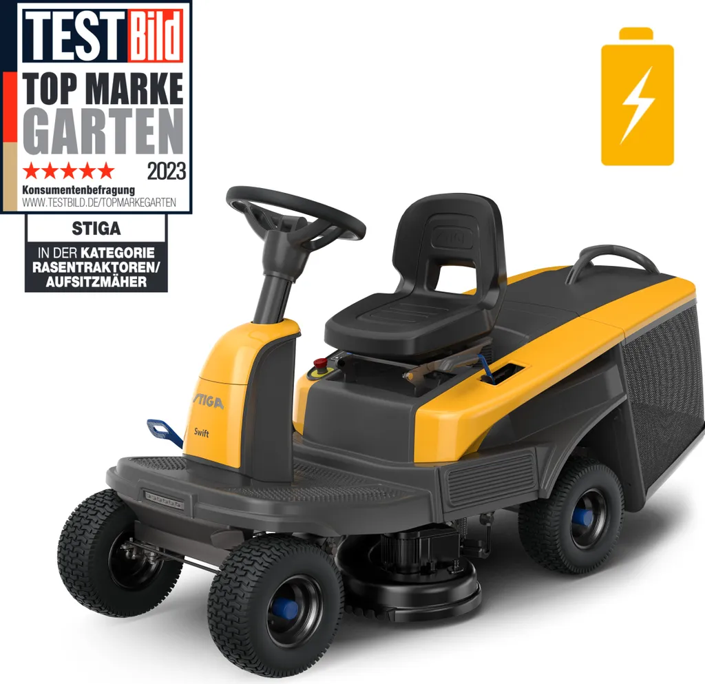 Mit dem STIGA Swift präsentieren wir die neusten Innovationen unseres Unternehmens. Dieser kompakte und wendige Traktor basiert auf unserem 48-Volt-System und kann mit den 5 Ah und 7,5 AH Akkus der STIGA 500-Serie (Akkumodelle 2021) betrieben werden. Somit kann der Rasentraktor je nach Bedarf entspannt eingesetzt werden, da die benötigten Akkus mit nur einem Klick ausgetauscht werden können (zum Betrieb des Rasentraktors werden mindestens 3 Akkus benötigt). Angetrieben wird der Swift von einem 1 kW starken Quermotor, der alleine für den Antrieb zuständig ist und eine stufenlose Geschwindigkeitsregulierung sowie eine Geschwindigkeit von bis zu 8,5 km/h ermöglicht. Der kleine Wendekreis und die dynamische Fahrweise sorgen für Spaß bei der Rasenpflege. Das Mähwerk ist mit zwei Messern ausgestattet und lässt sich über eine elektromagnetische Kupplung bedienen. Für jedes Messer ist ein passender Antrieb vorhanden, der konstruktionsbedingt weder einen Riemen noch eine Riemenscheibe benötigt und somit keinerlei Leistungseinbußen verursacht. Die bürstenlose Bauweise sorgt für einen nahezu verschleißfreien Betrieb und eine wartungsfreie Nutzung. Der Mäher verfügt über eine Schnittbreite von 72 cm, wobei sich die Schnitthöhe 6-fach von 30 bis 80 mm verstellen lässt. Das anfallende Schnittgut wird in einem 170 Liter fassenden Auffangkorb gesammelt. Für die nötige Energie sorgen beim STIGA Swift zwei E 475 Akkus (48 Volt, 7,5 Ah) und zwei E 450 Akkus (48 Volt, 5 Ah). Der Rasentraktor ist für Rasenflächen bis 2000 m2 und im Eco-Modus bis 2600 m2 geeignet. Der integrierte Wasseranschluss ermöglicht eine einfache Reinigung nach der Arbeit. Der Rasentraktor wird teilgeliefert. Teil der STIGA ePower-Familie und daher mit den Handgeräten der 500er-Serie kompatibel, für 5 Ah-Akkus wird ein Adapter für Handgeräte benötigt. Der Rasentraktor wird teilgeliefert.