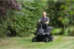 Ausgestattet ist dieser Mäher mit einem 170 Liter fassenden Hängekorb, der sich vom Sitz aus durch Ziehen am Griff entleeren lässt.